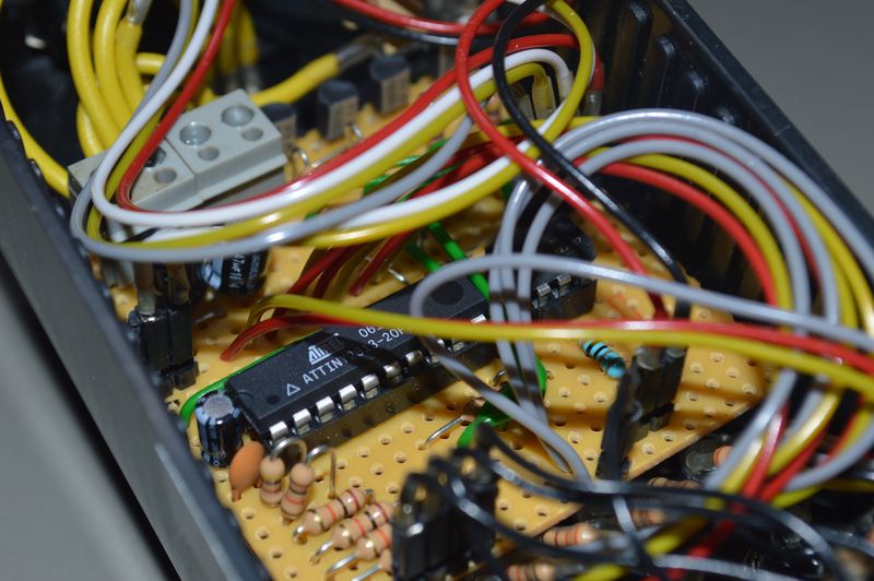 Electronic switch for LED lights, 4 channels, 9 to 24 volts in, 5 volts out. Uses an AVR ATtiny2313 microcontroller.