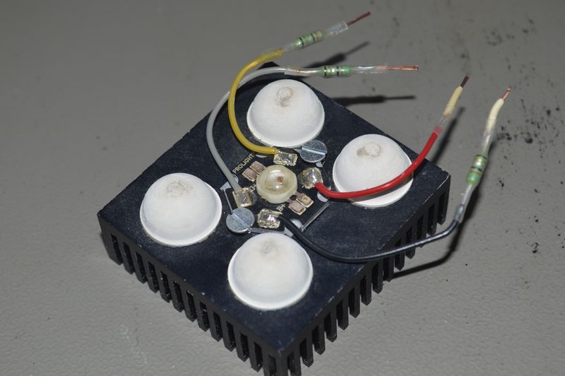Between the LED and the heat sink there is some heat conducting film, to better dissipate the heat. The LED is common anode, with resistors for use on 5 volts. It gives off 30 lumens of light in 140 degrees.