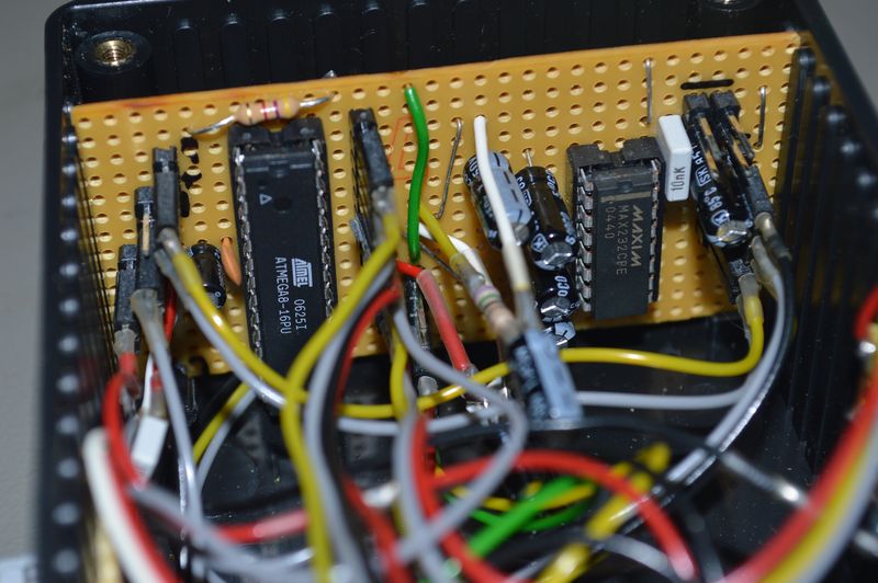 I rebuilt an existing interface module — to be a stand-alone temperature and light sensor, with serial RS-232 interface and some signal LEDs. Uses an AVR ATmega8 microcontroller.
