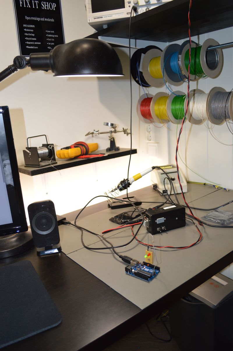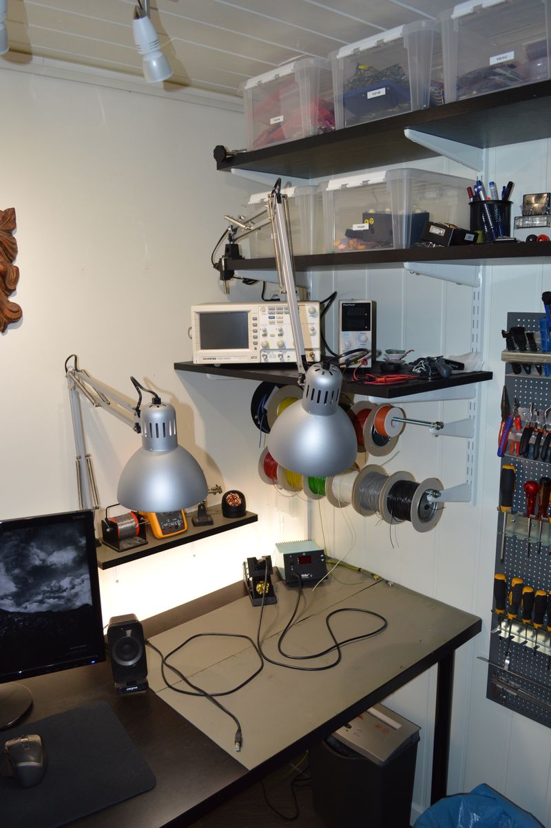 I had an old IKEA shelf and a speaker stand lying around, so I cut the shelf to size and made a tiny table. It adds a bit of work or storage surface, and every bit helps 🙂 The tool wall allows me to keep all of my most used tools and cables within arms reach. The hot air gun is plugged in and ready to go.