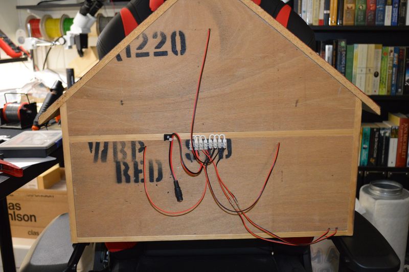 I mounted a terminal block on the back of the miniature house; this makes it easy to expand with more lights next year 🙂 The backside will not be visible, so the aesthetics were not that important. The 5V AC adapter is connected via a power jack.