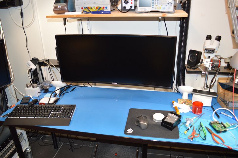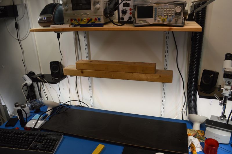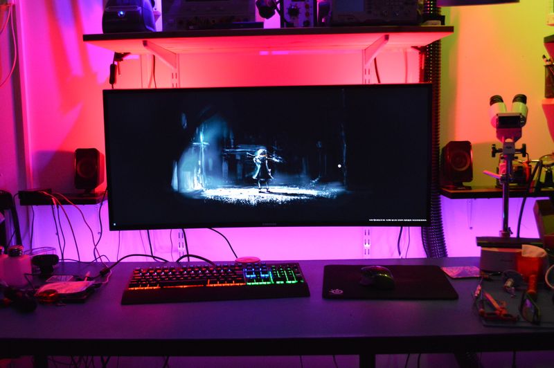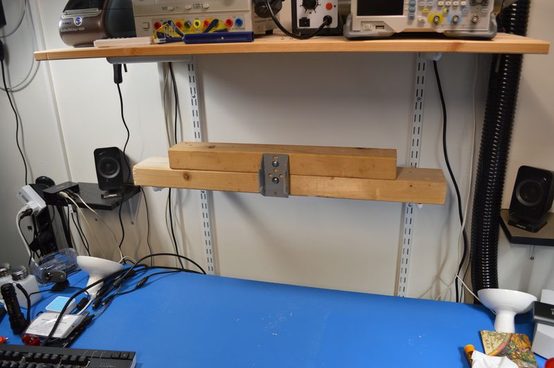 I used the have the ultrawide monitor on a shelf in front of me, but I wanted it a bit closer and to be able to use the space below the monitor. So instead I used some scrap wood, a cheap VESA mount I had, and the brackets for the shelf to make it “float”.