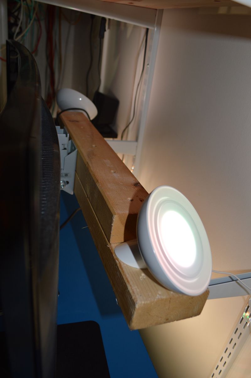 I glued and screwed two two-by-fours together, the top one being slightly shorter — to leave space for some Hue lights. I mounted these on two shelf brackets.