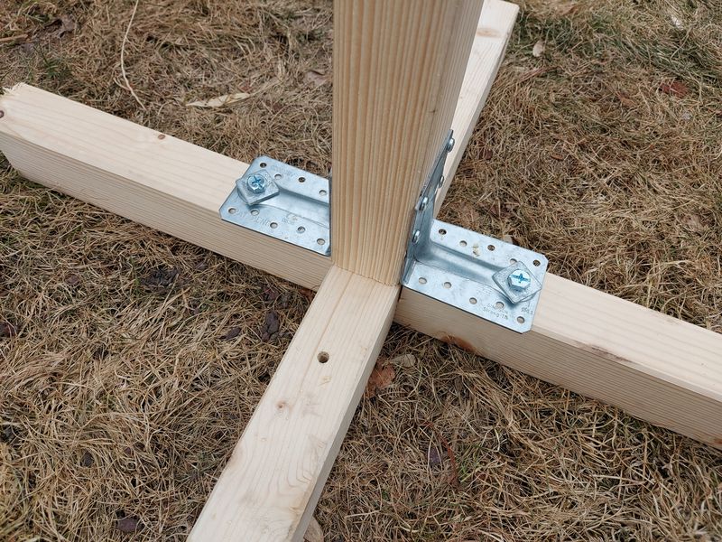 I made cut-outs in the lumber for the foot, so they could be placed to form a cross. The pole is secured with angle brackets, and two bolts to the foot. It can be disassembled simply by removing those two bolts, to take up less space when stored in the winter.