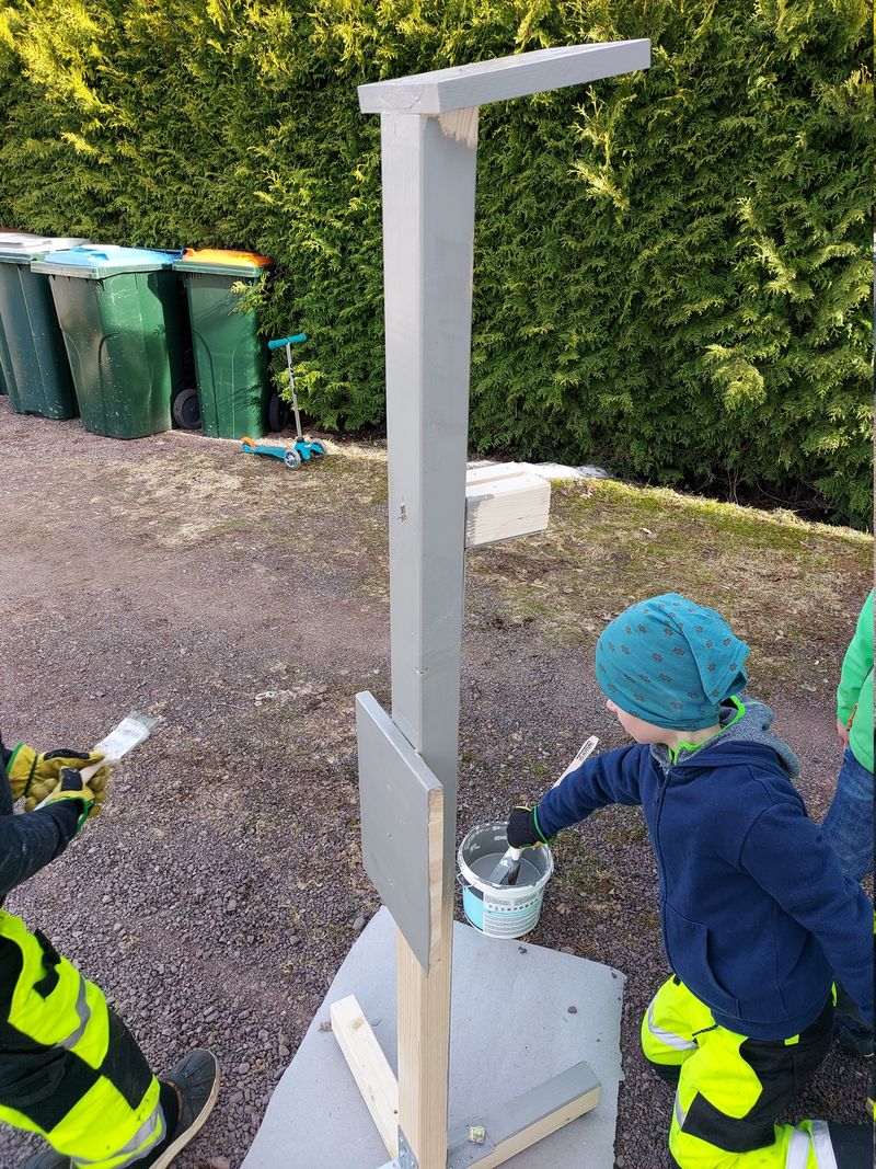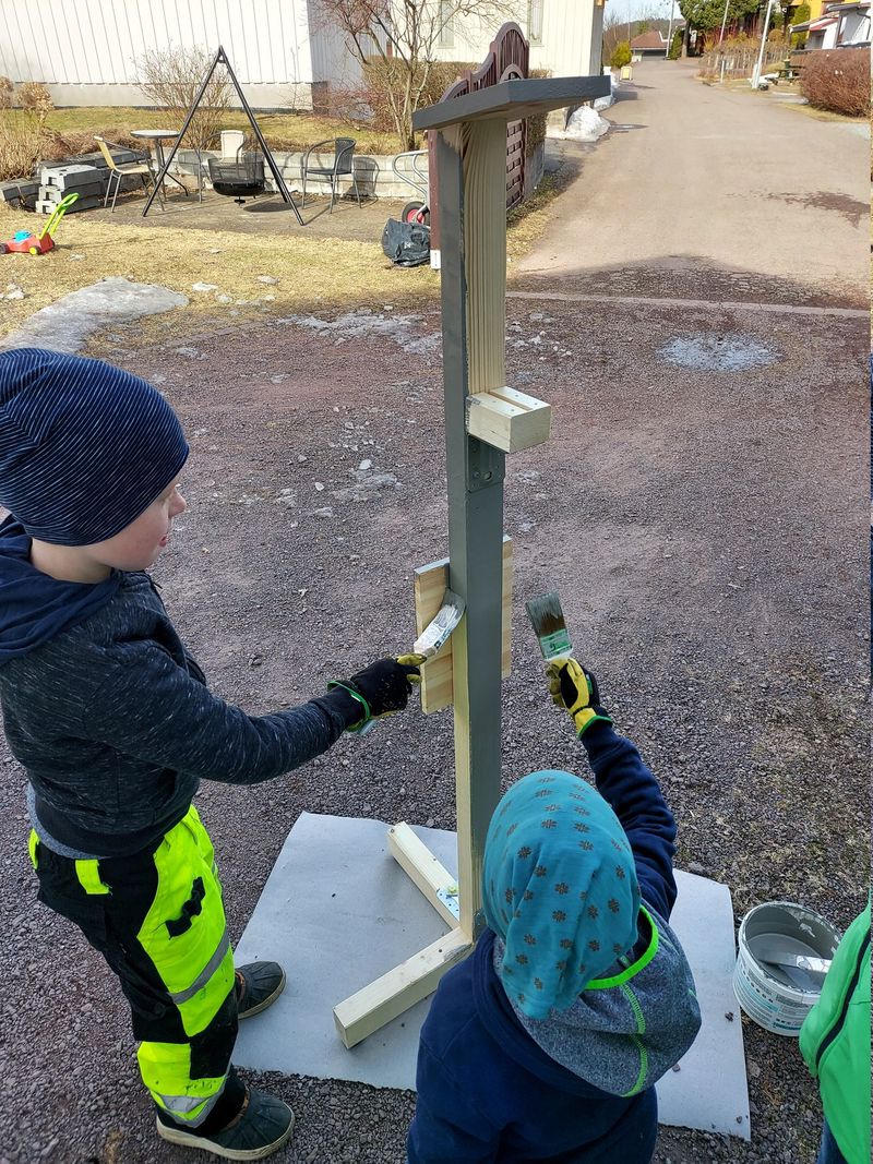 I originally intended for it to be black, but I couldn’t find the black paint. And we had some grey left over, and I didn’t want to go to the store. So the kids painted it grey 😃