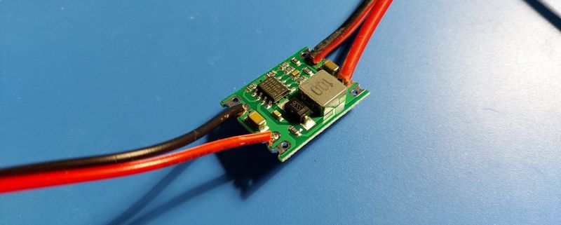 To make it portable I wanted to run the entire thing on a 12V battery. To power the Raspberry Pi 5V is needed as well, for that I used a step-down converter that I just put in a heat-shrink tube.