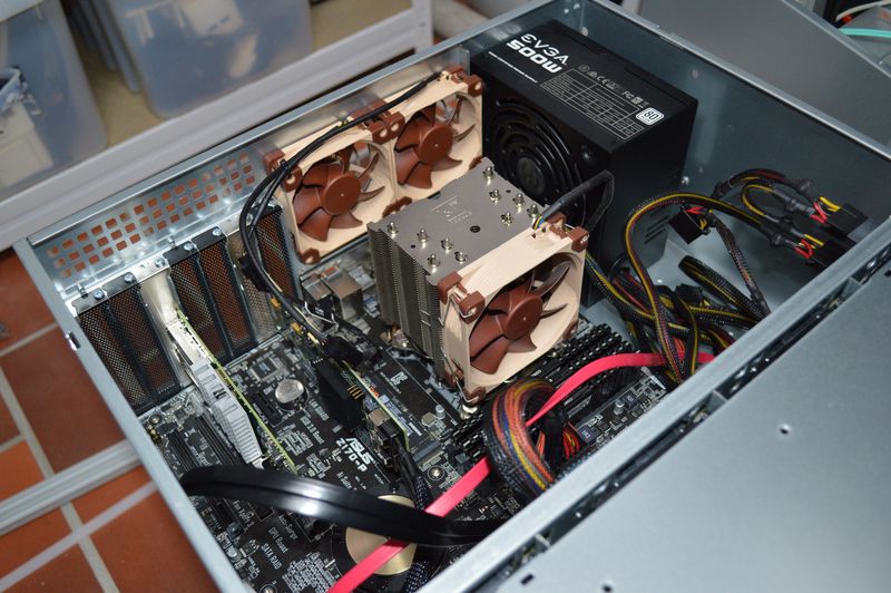 The two 80 mm Noctua fans in the back was a tight fit, I had to grind off a screw thread and make a groove in the right Noctua fan.