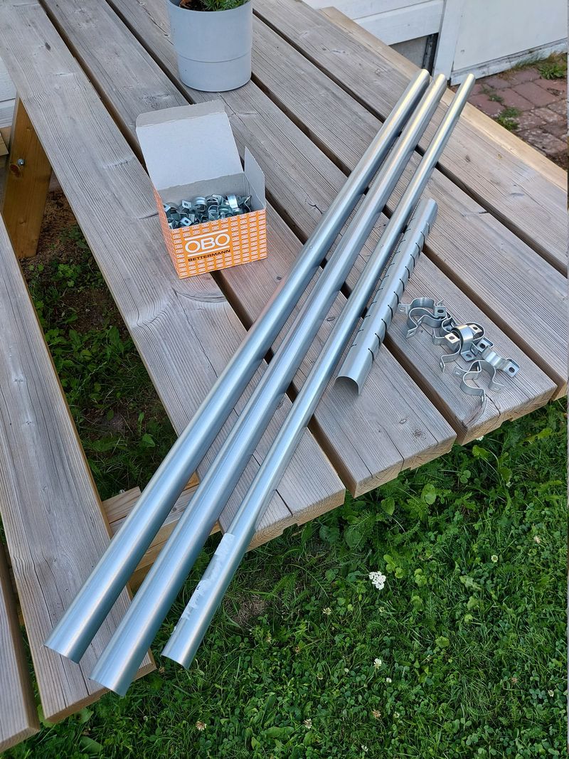 Then two lengths of metal cable guard going up the beam, totalling 2.4 meters. The guards covers both the new conduit and the existing power cable for the garage.