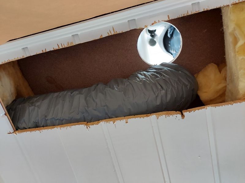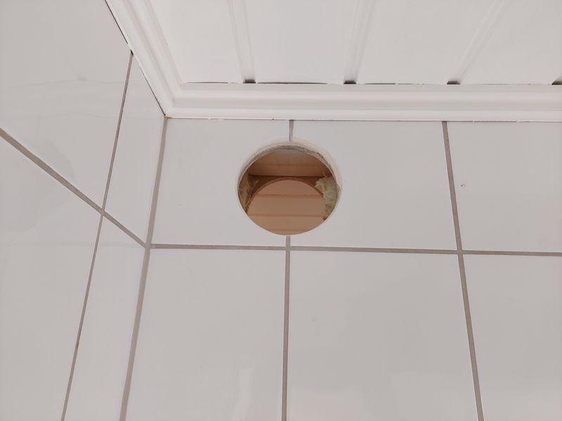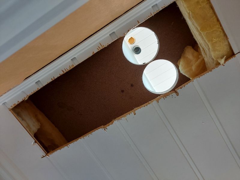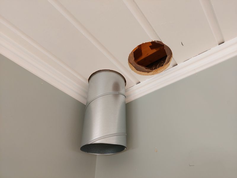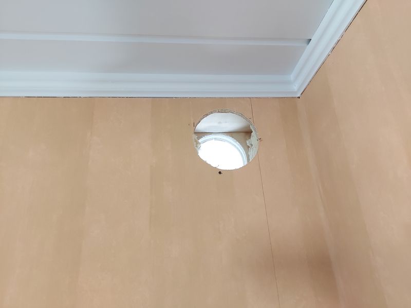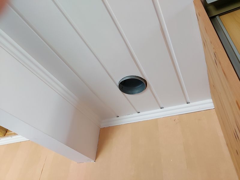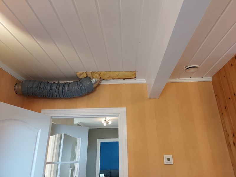 This is how it looks now in the 1st floor play room. With the noise trap for the laundry room exhaust visible, we will build a box to hide it and the opening in the ceiling.