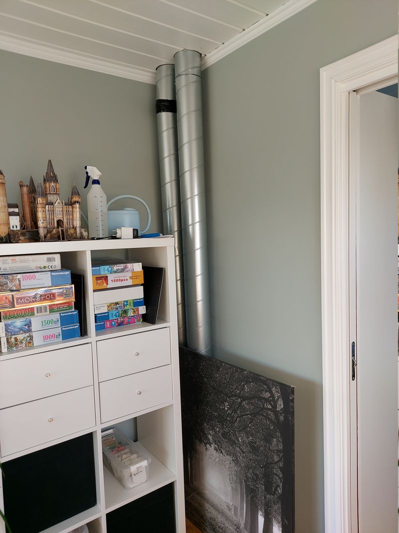 I spent a lot of time thinking, and measuring, trying to find the best way to get from the attic to the 1st floor with two 125mm (5") ducts. Obviously they needed to go through the 2nd floor — but I wanted them to waste as little space as possible in the 2nd floor den.