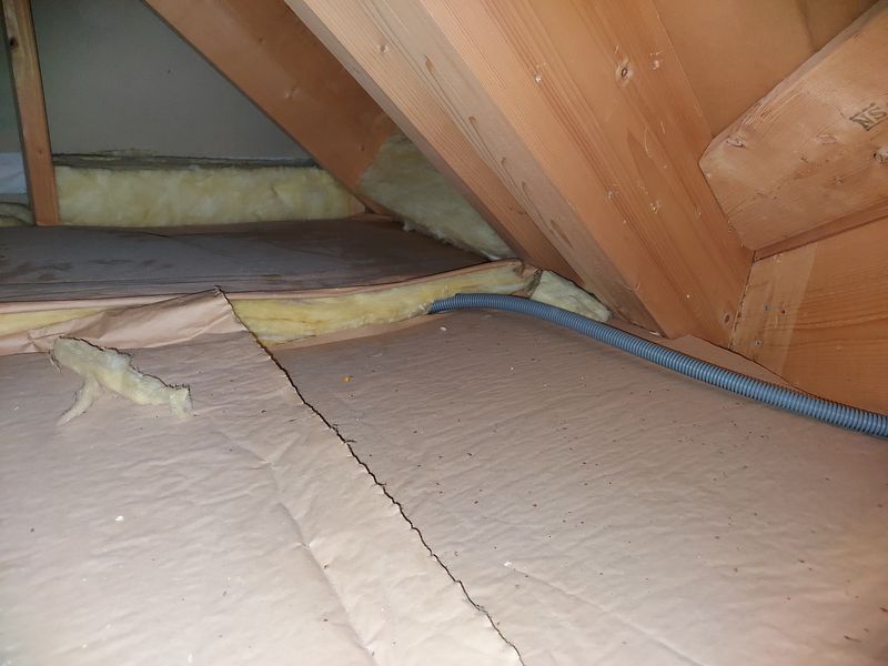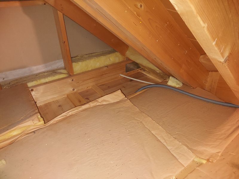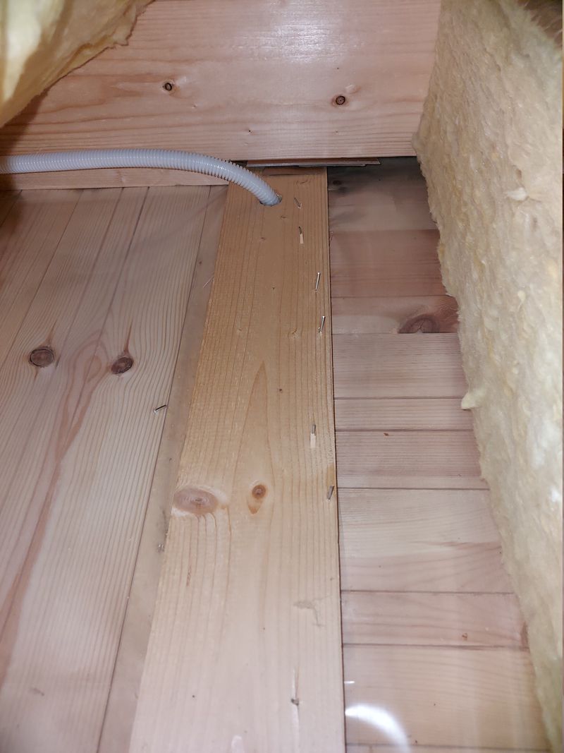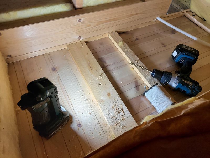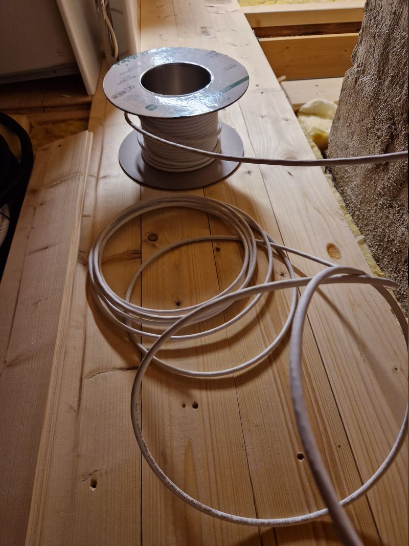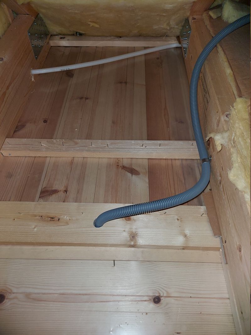 Then it was time to get up in the attic and find the wall β which turned out to be really easy 😎 The ceiling boards are in different directions in the two rooms, and I knew the conduit to the light switch went down into the same wall.