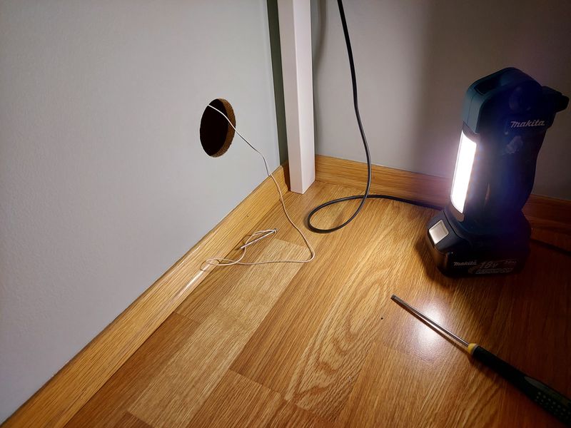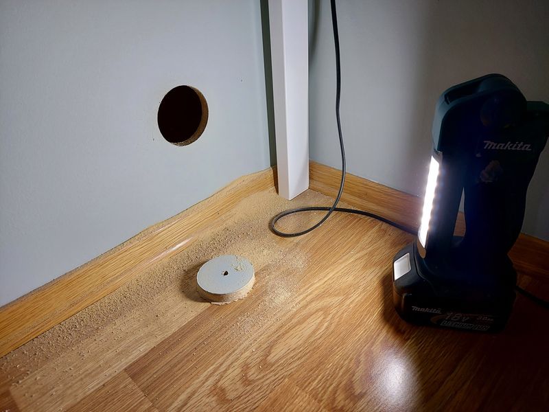 I started by drilling a small hole, just to verify that it didn’t come out in the ceiling somewhere.