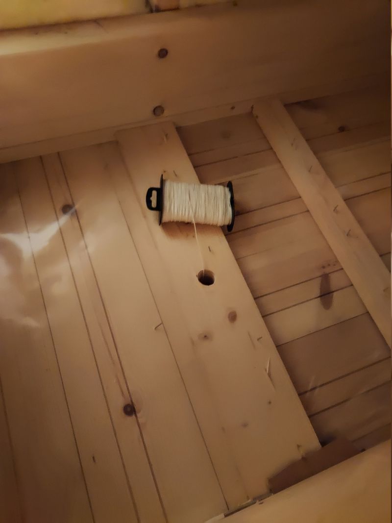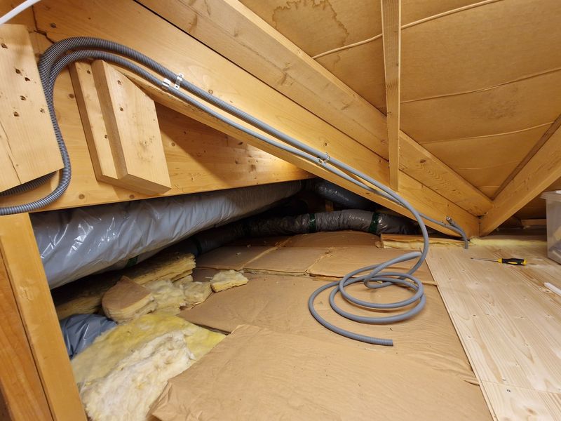 Back in the attic β I cut the string, and attached it to the conduit. Now I could use the string to pull the conduit down, and out of the hole in the wall.