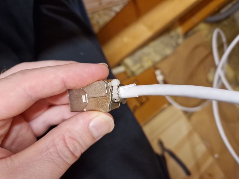 The tool-free keystone jacks I used were for CAT6A, which is thicker than CAT6, so I wrapped some left-over cable jacket around the CAT6 cable β for the zip-tie to get a better hold.