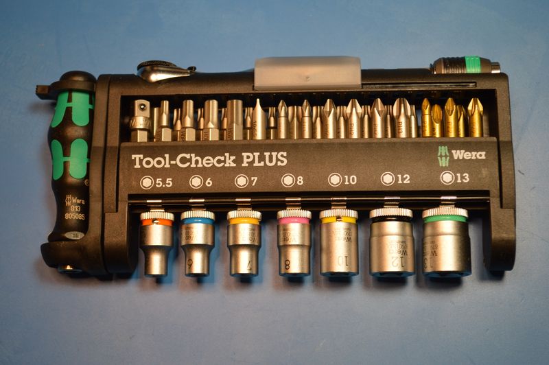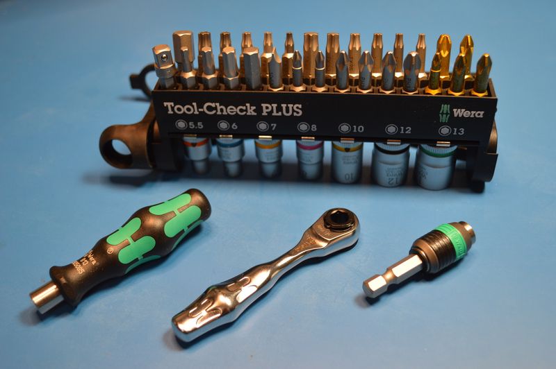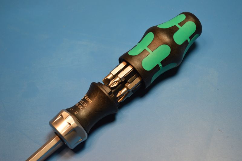 My last Wera purchase was a set with 39 pieces: a small bit-holding screwdriver, bit ratchet, and lots of screwdriver bits and ¼" sockets. The ratchet is really small and handy for tight places.