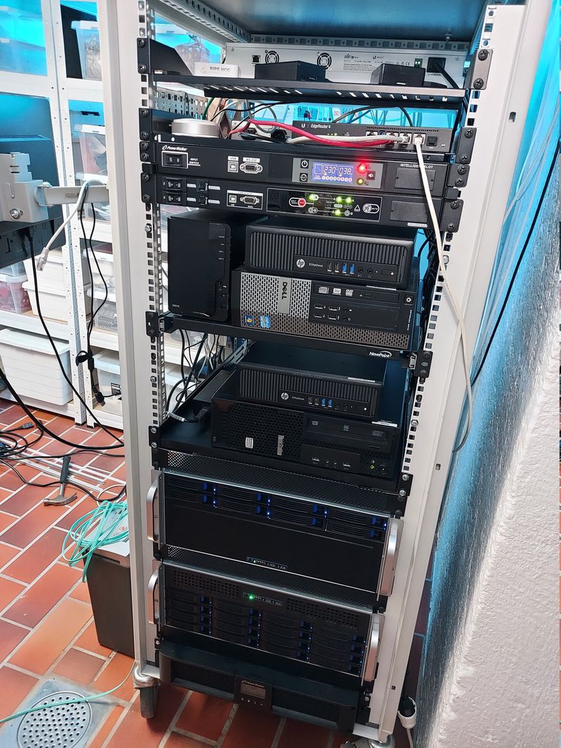 In 2010 I bought a house, and suddenly I had a server room. I got the rack for free from a friend, finally a proper rack — it was an old audio rack from a school. I still have, and use, this rack today (but the glass door had to go) 🙂