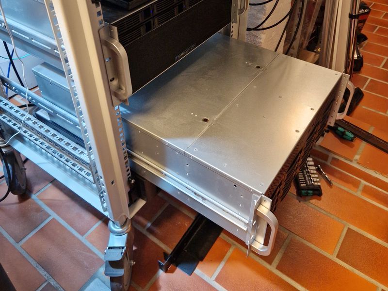 My server rack is 600x600 mm, and the server case is 688 mm deepβ¦ So the case sticks out about 9 cm behind the rack. Not really a problem β and the rails, with the variable depth, fit just fine 🙂